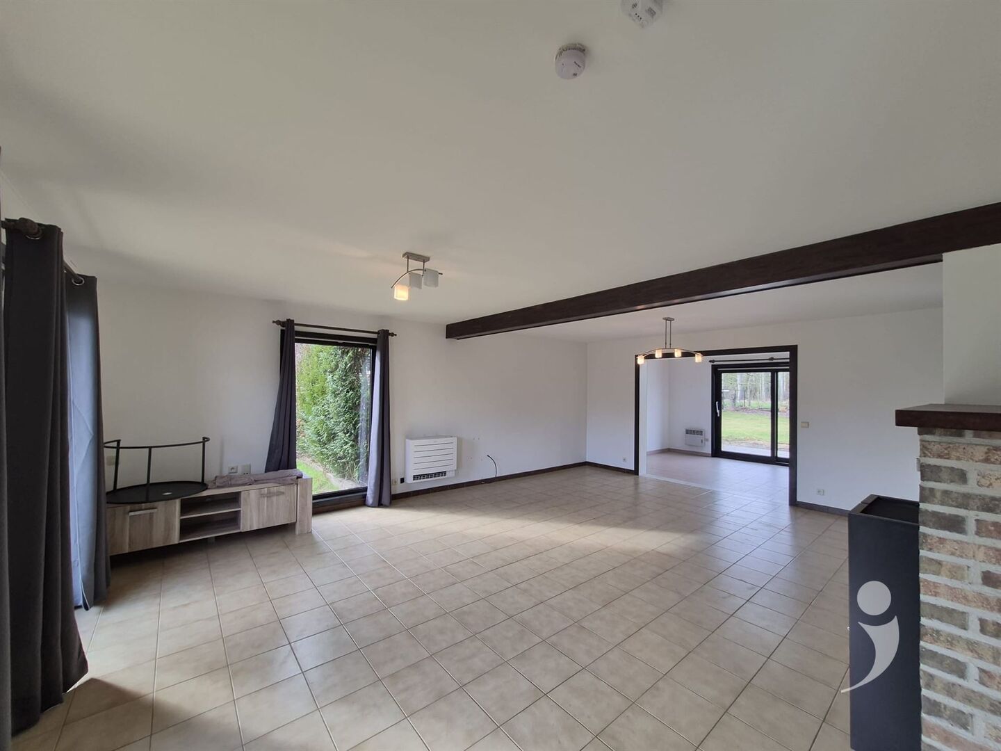 a large living room with a pellet stove.