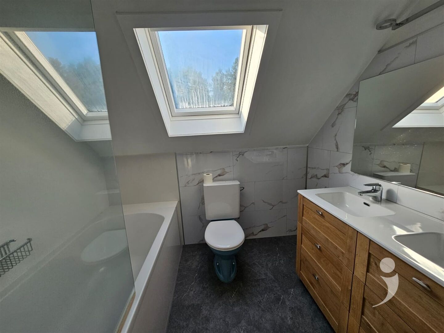 Renovated bathroom with bath, shower, sink and toilet.