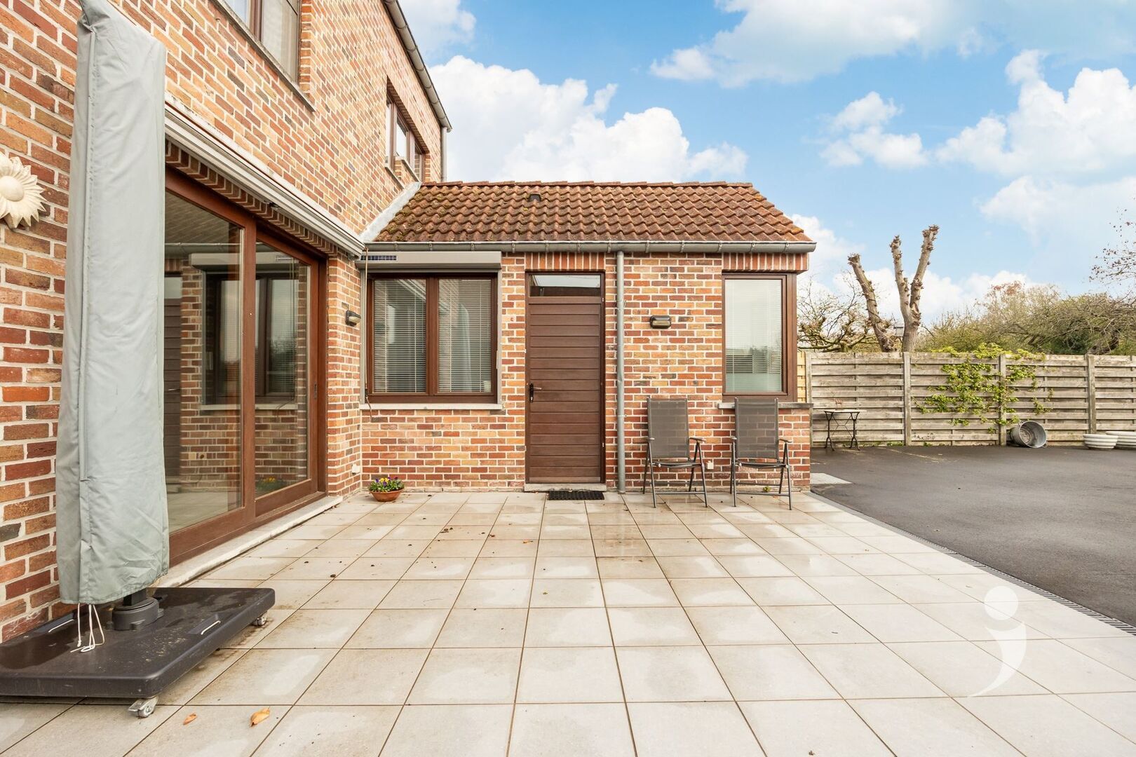 Upon entering the house you enter the spacious entrance hall with guest toilet. From here you walk through to the bright living space where large windows provide a pleasant view of the garden. The presence of a heat pump unit contributes to the contemporary living comfort. Adjacent is the practical kitchen with storage room. Behind the kitchen there is a spacious utility room/laundry room equipped with a shower.