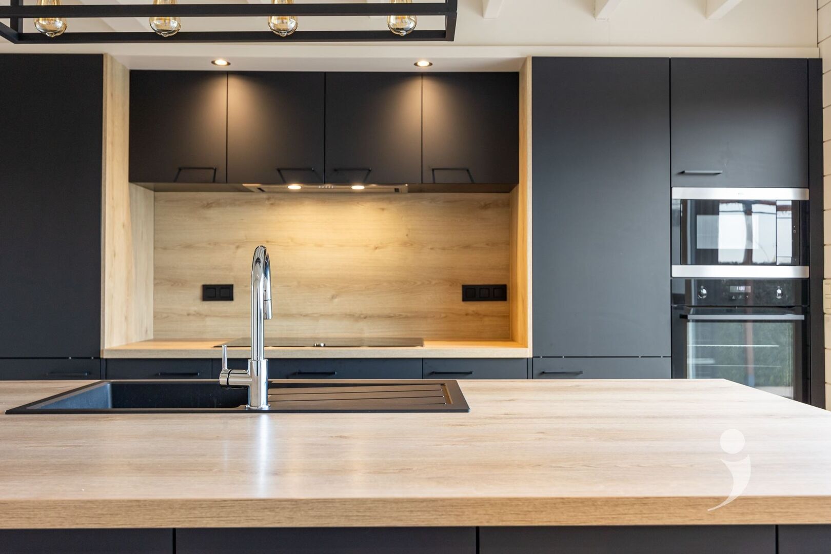 The modern kitchen is fully equipped with all modern comforts: a stylish cooking island, built-in appliances, dishwasher and plenty of cupboard space.