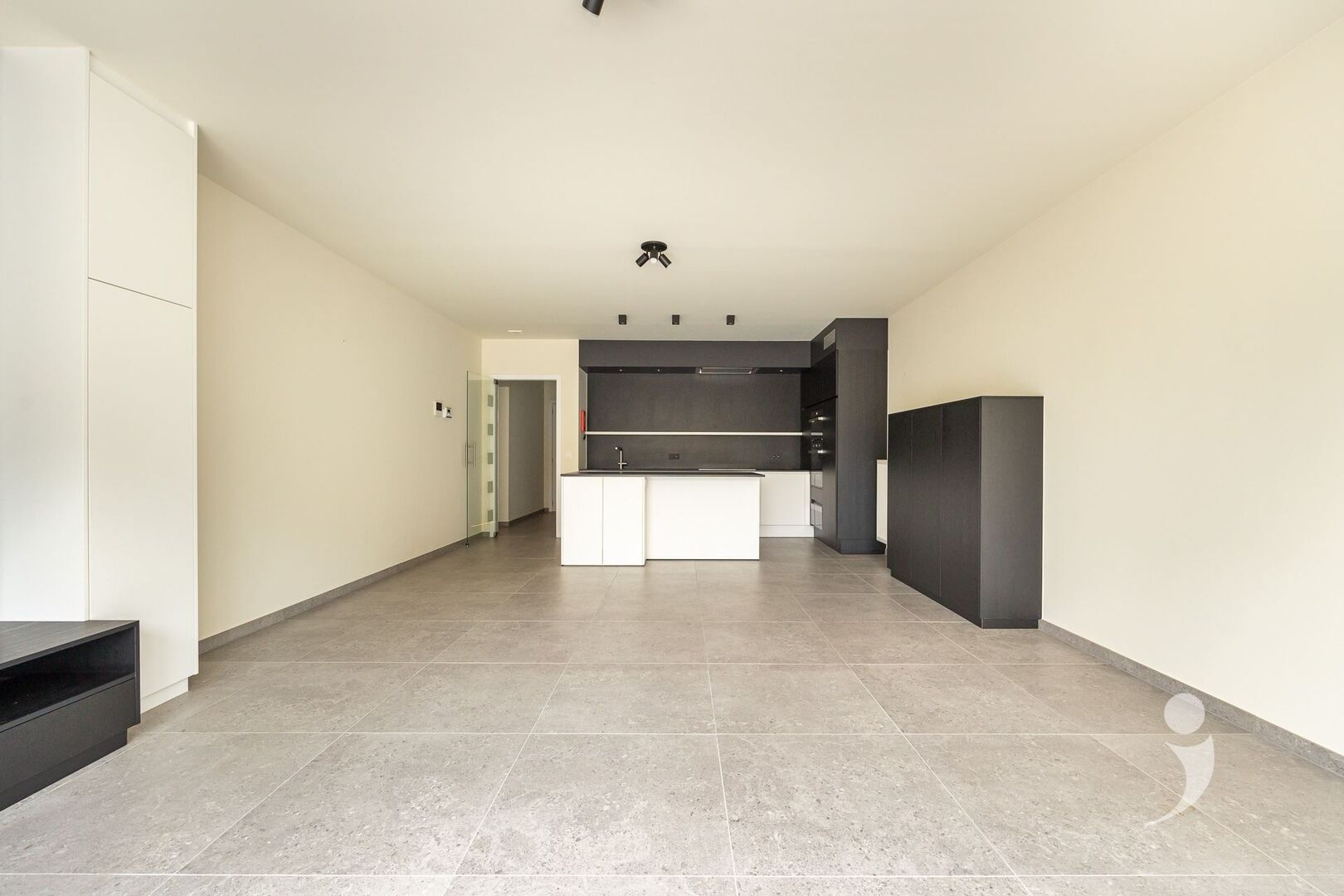 Er is een lichtrijke leefruimte (42 m²) met open keuken en kookeiland. De keuken is volledig uitgerust met moderne toestellen: ingebouwde koelkast, vaatwasser, oven, microgolf, warmhoudlade, inductiekookplaat en een stijlvol werkblad. Achteraan het appartement bevindt zich een tweede, royale slaapkamer (20 m²) met ingebouwde kasten. Hiernaast is er nog een tweede badkamer met ligbad, douche en wastafel. Verder is er ook nog een tweede toilet, alsook een zeer handige extra bergruimte met inbouwkasten, alsook de aansluiting voor wasmachine en droogkast.