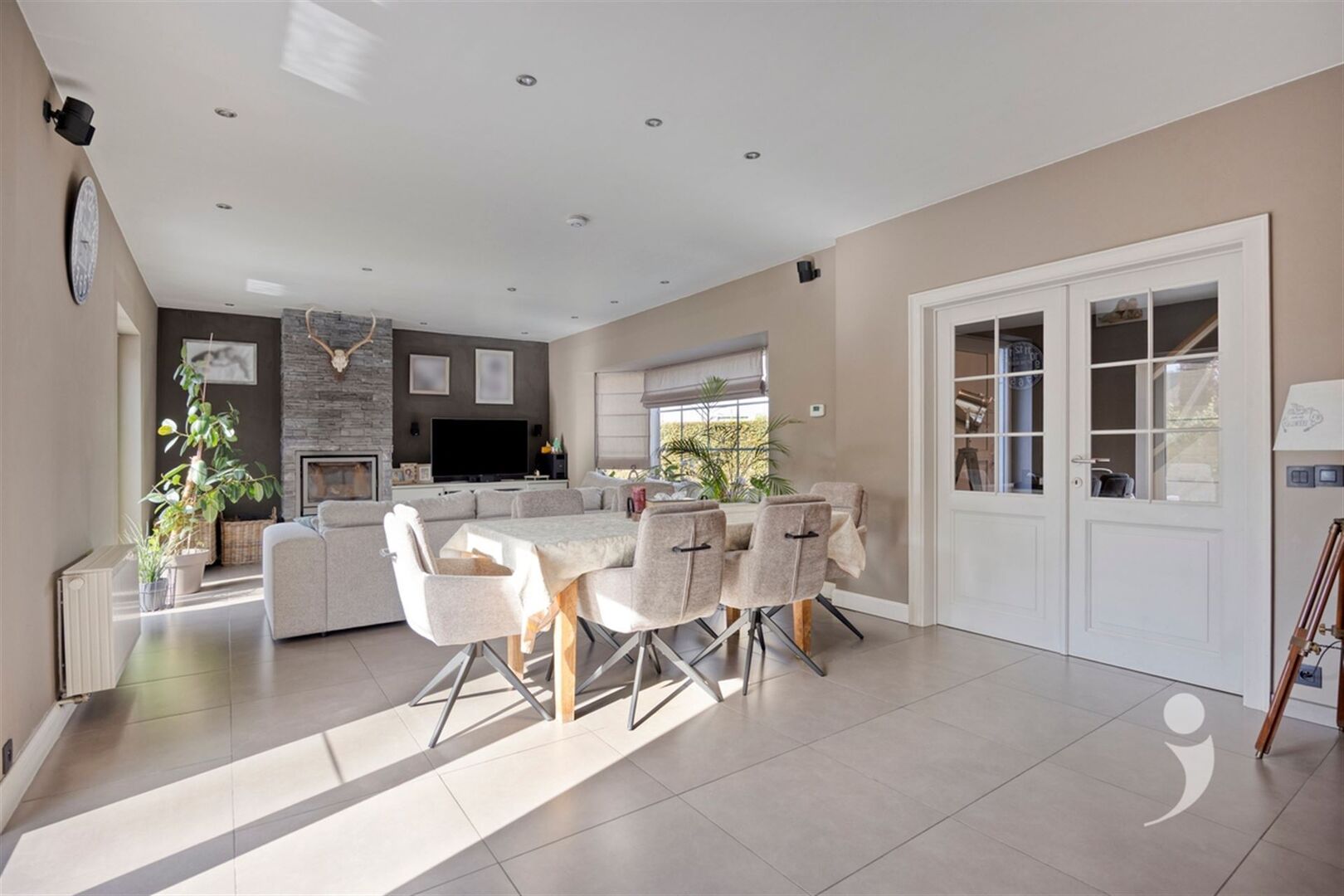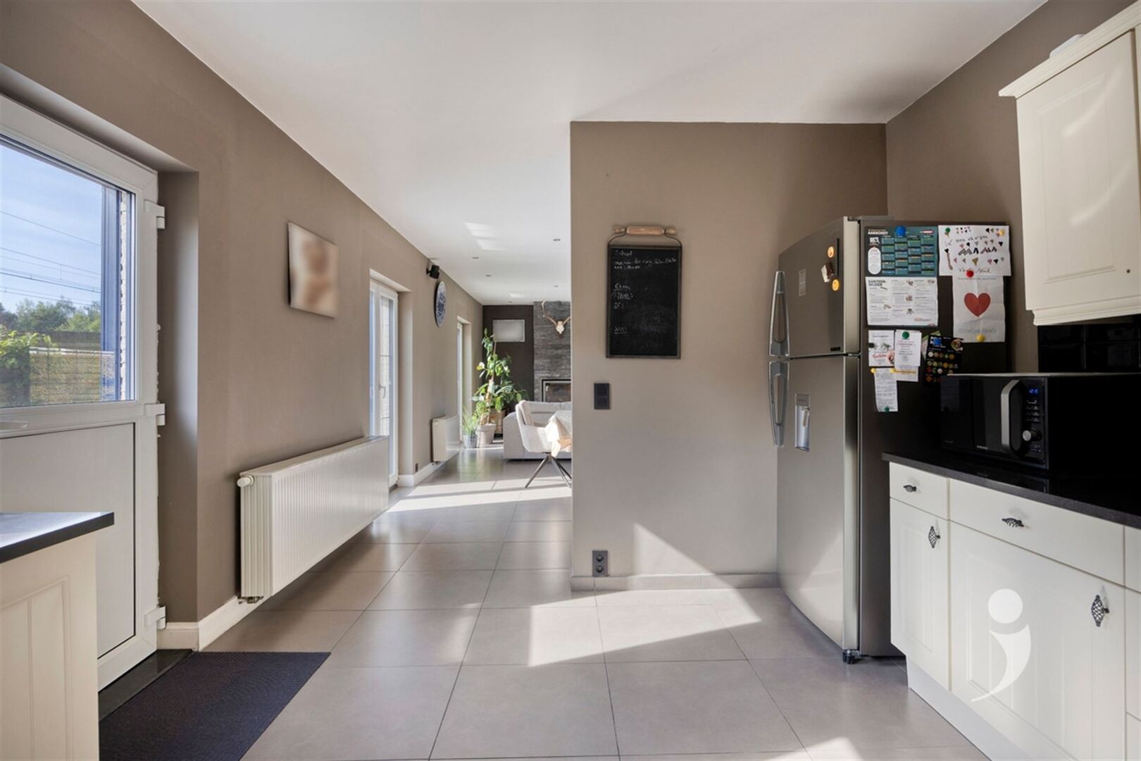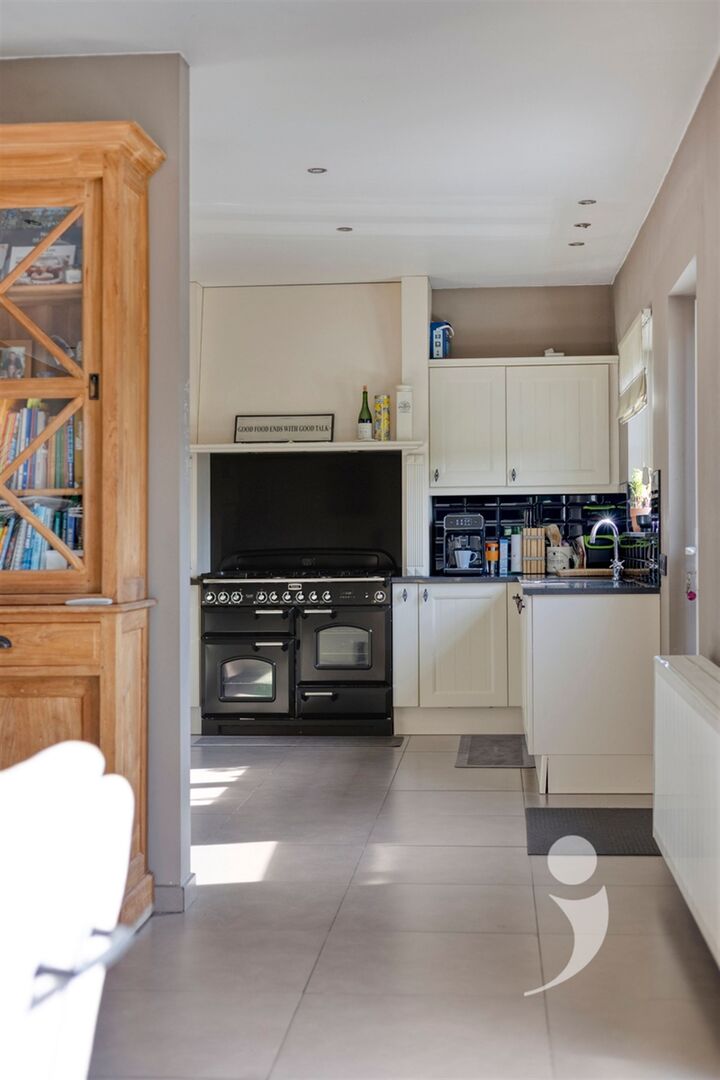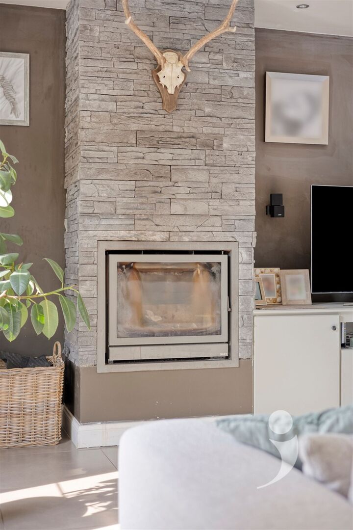 De lichtrijke leefruimte met houtkachel vormt het hart van de woning en straalt pure gezelligheid uit. Aansluitend bevinden zich de eetplaats en de volledig uitgeruste keuken, voorzien van alle nodige comfort, voldoende kastruimte en kwalitatieve toestellen ideaal voor wie graag kookt en geniet.
