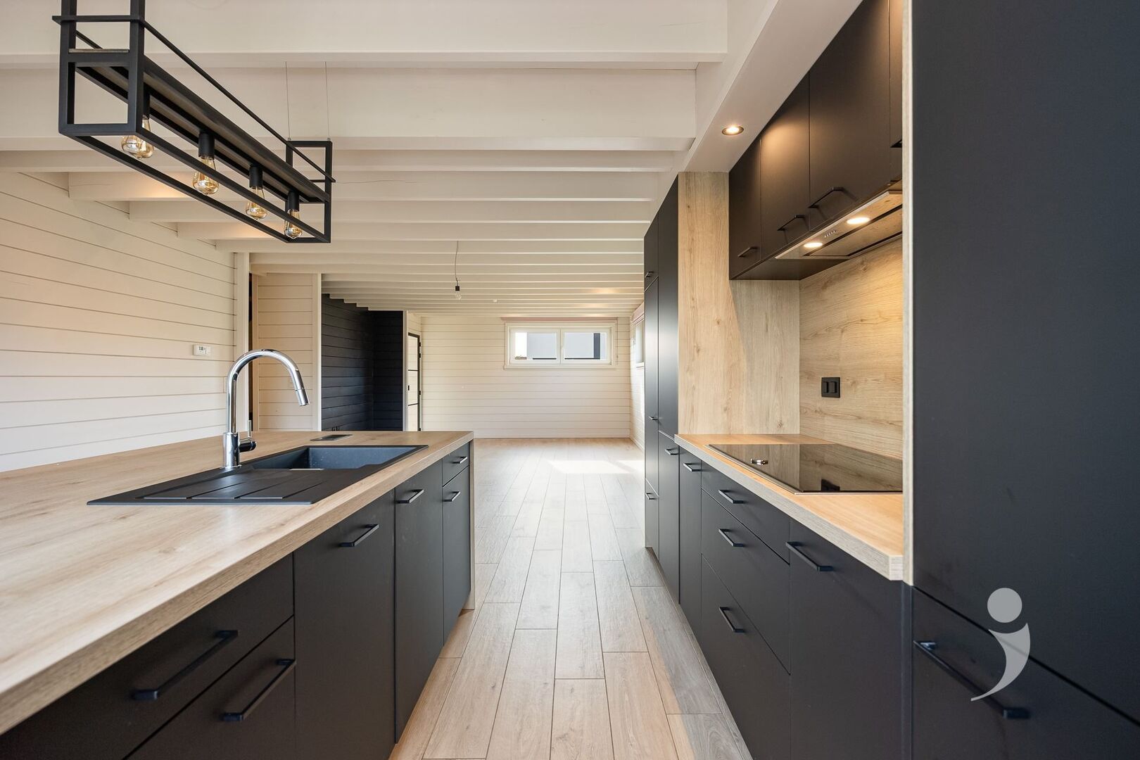De moderne keuken is volledig uitgerust en voorzien van alle hedendaags comfort: een stijlvol kookeiland, ingebouwde toestellen, vaatwasser en overvloed aan kastruimte.