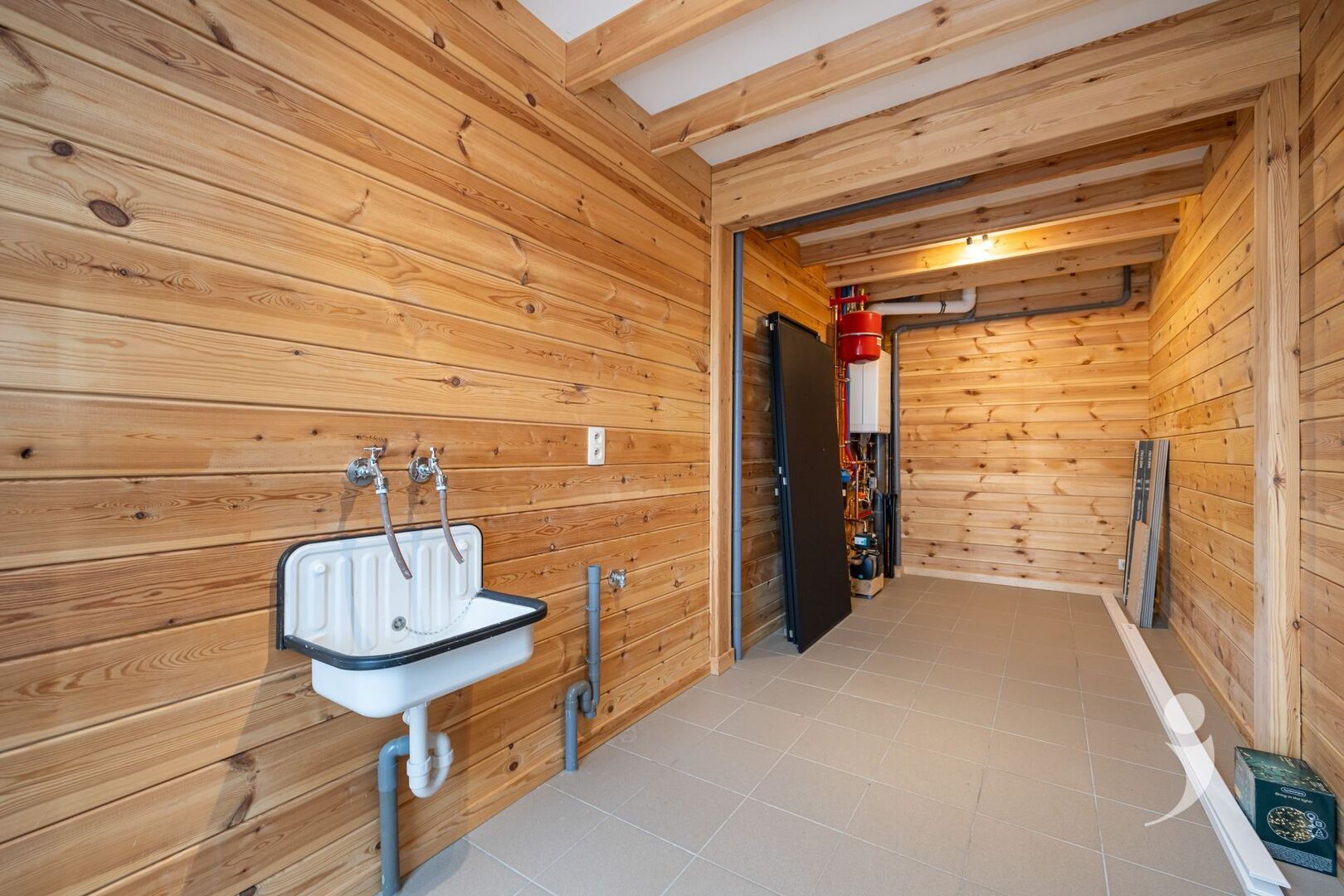 Aansluitend bevindt zich een aparte bergruimte met aansluiting voor wasmachine en droogkast.