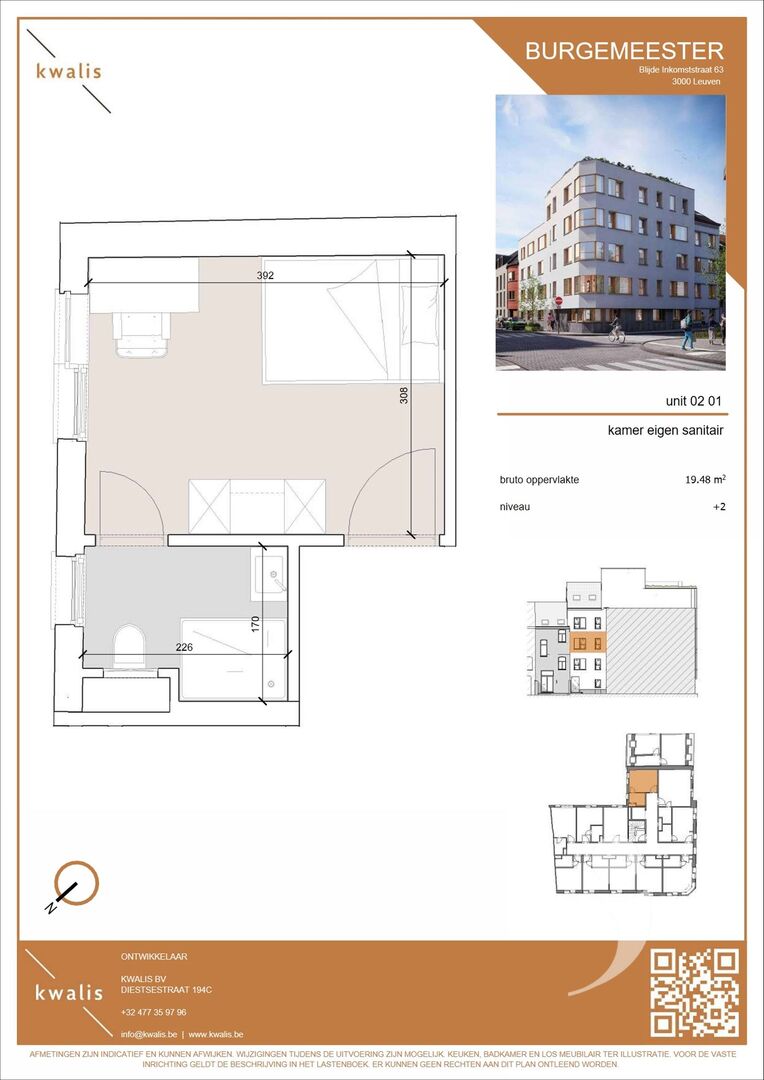 De unit maakt deel uit van Studentenresidentie Burgemeester: een hoogwaardig studentenproject met 41 kwalitatieve studentenkamers en studio’s in de Blijde Inkomststraat in Leuven, op wandelafstand van faculteiten, station en het stadscentrum.