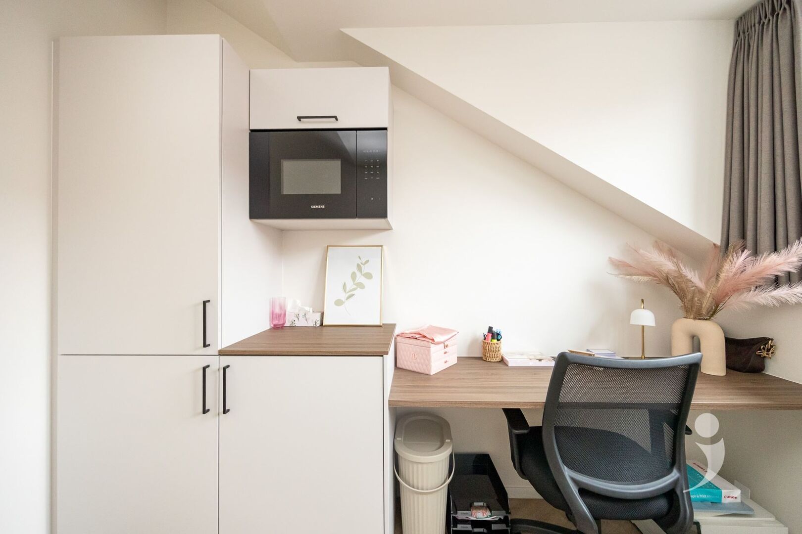 De kamer ligt op de eerste verdieping en wordt ingericht met een design meubel met hoogslaper van 1.40m x 2.00m, waaronder zich een bureau met stoel bevindt. Verder is de kamer uitgerust met een ingebouwde kleerkast, gordijn en een praktisch ontbijtblok met magnetron en koelkast. De kamer is bovendien voorzien van een douche en lavabo, wat zorgt voor extra comfort en privacy.